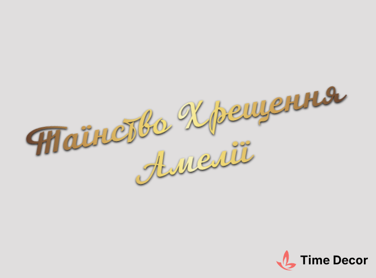 Пластиковий напис "Таїнство Хрещення Амелії" – дзеркальний або матовий пластик, можливе виготовлення з клейкою зворотною поверхнею для легкого монтажу.
