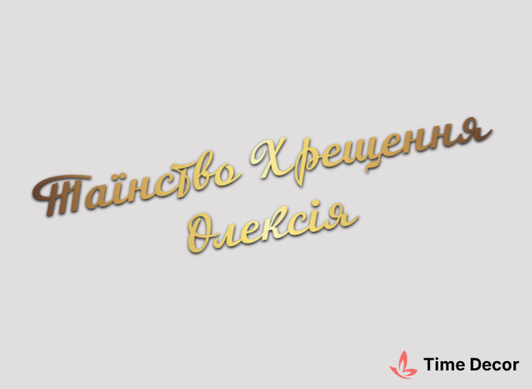 Пластиковий напис "Таїнство Хрещення Олексiя" – дзеркальний або матовий пластик, можливе виготовлення з клейкою зворотною поверхнею для легкого монтажу.