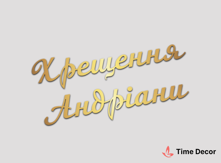 Пластиковий напис "Хрещення Андріани" – дзеркальний або матовий пластик, можливе виготовлення з клейкою зворотною поверхнею для легкого монтажу.