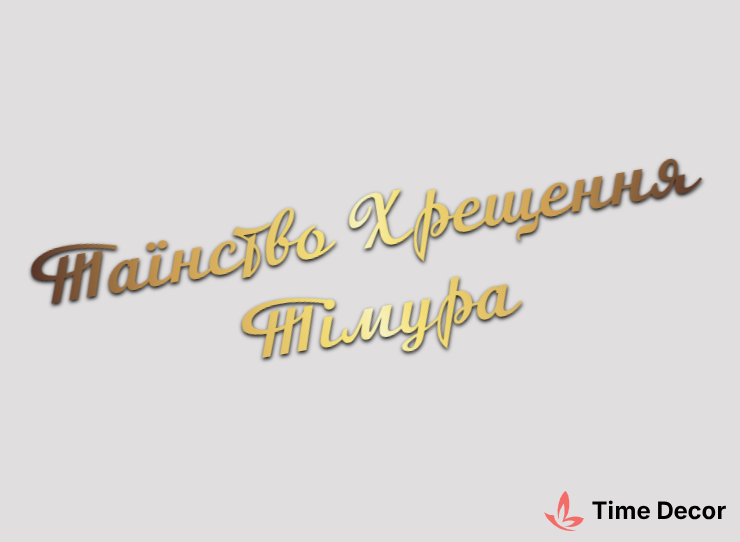 Пластиковий напис "Таїнство Хрещення Тімура" – дзеркальний або матовий пластик, можливе виготовлення з клейкою зворотною поверхнею для легкого монтажу.
