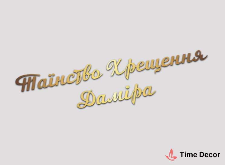 Пластиковий напис "Таїнство Хрещення Даміра" – дзеркальний або матовий пластик, можливе виготовлення з клейкою зворотною поверхнею для легкого монтажу.