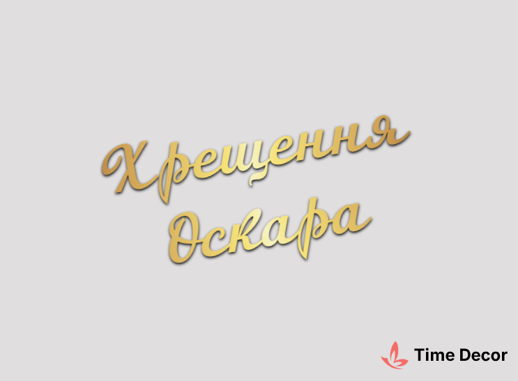 Пластиковий напис "Хрещення Оскара" – дзеркальний або матовий пластик, можливе виготовлення з клейкою зворотною поверхнею для легкого монтажу.