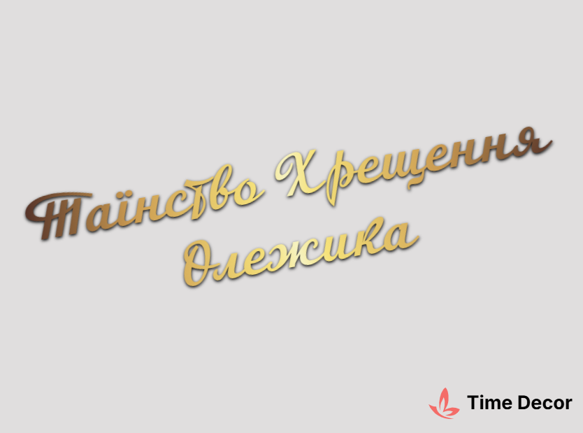 Пластиковий напис "Таїнство Хрещення Олежика" – дзеркальний або матовий пластик, можливе виготовлення з клейкою зворотною поверхнею для легкого монтажу.
