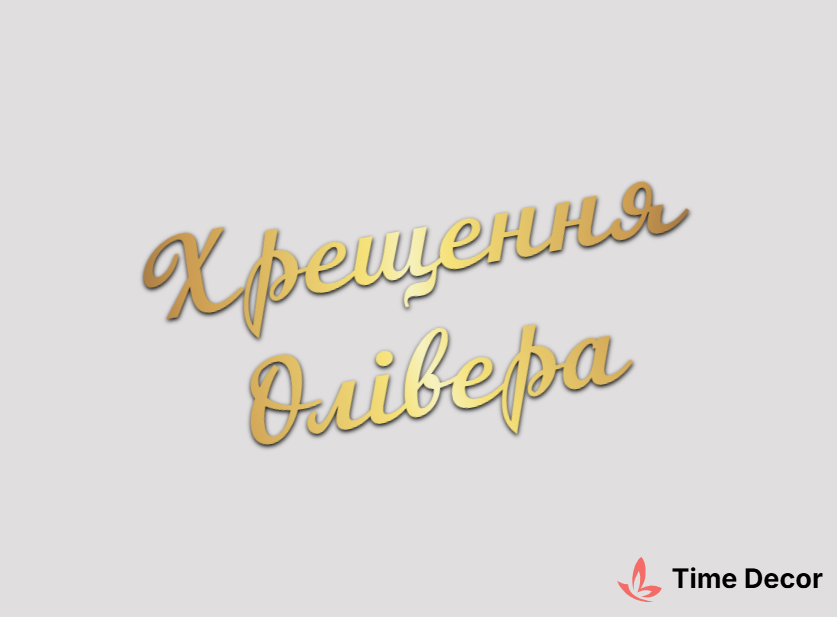 Пластиковий напис "Хрещення Олівера" – дзеркальний або матовий пластик, можливе виготовлення з клейкою зворотною поверхнею для легкого монтажу.