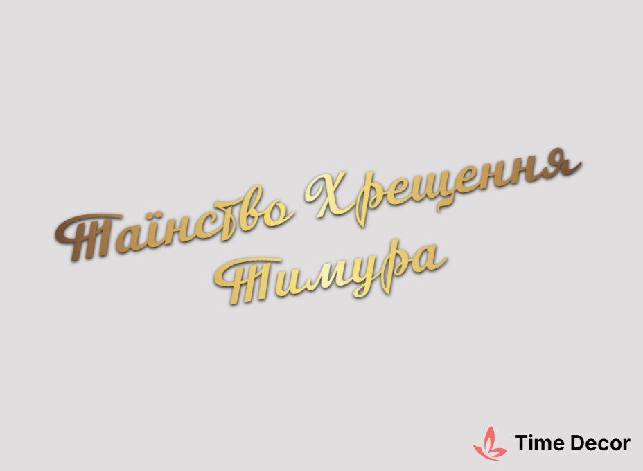 Пластиковий напис "Таїнство Хрещення Тимура" – дзеркальний або матовий пластик, можливе виготовлення з клейкою зворотною поверхнею для легкого монтажу.