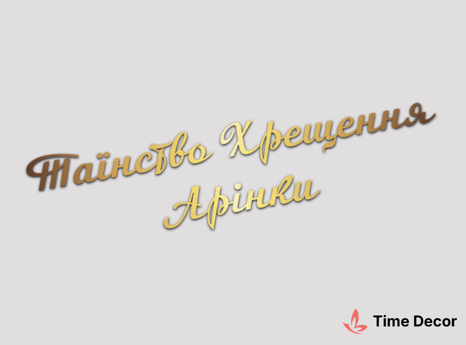 Пластиковий напис "Таїнство Хрещення Арінки" – дзеркальний або матовий пластик, можливе виготовлення з клейкою зворотною поверхнею для легкого монтажу.