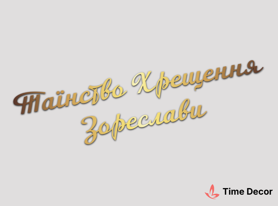 Пластиковий напис "Таїнство Хрещення Зореслави" – дзеркальний або матовий пластик, можливе виготовлення з клейкою зворотною поверхнею для легкого монтажу.