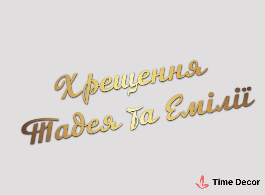 Пластиковий напис "Хрещення Тадея та Емілії" – дзеркальний або матовий пластик, можливе виготовлення з клейкою зворотною поверхнею для легкого монтажу.