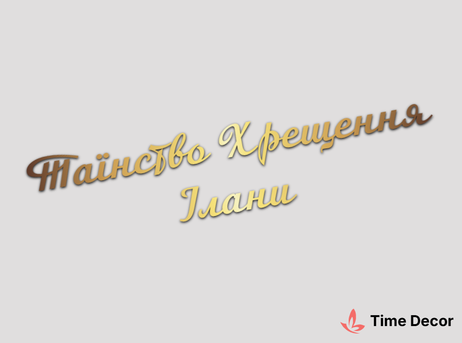 Пластиковий напис "Таїнство Хрещення Ілани" – дзеркальний або матовий пластик, можливе виготовлення з клейкою зворотною поверхнею для легкого монтажу.