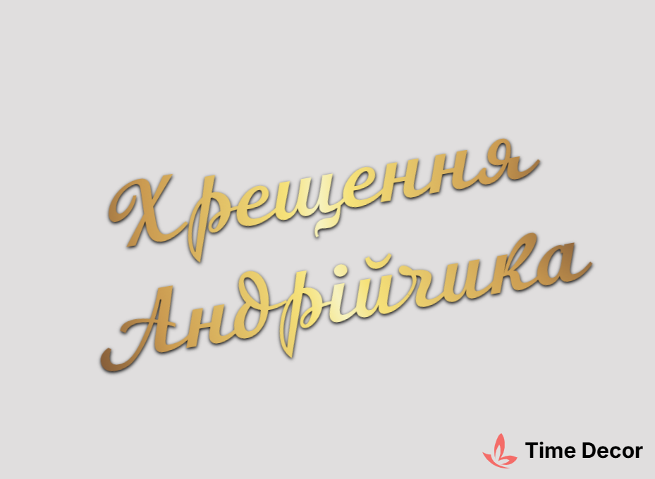 Пластиковий напис "Хрещення Андрійчика" – дзеркальний або матовий пластик, можливе виготовлення з клейкою зворотною поверхнею для легкого монтажу.