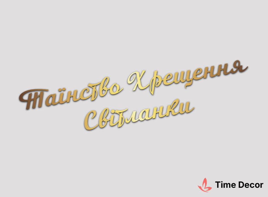 Пластиковий напис "Таїнство Хрещення Світланки" – дзеркальний або матовий пластик, можливе виготовлення з клейкою зворотною поверхнею для легкого монтажу.