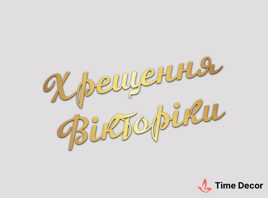 Пластиковий напис "Хрещення Вікторіки" – дзеркальний або матовий пластик, можливе виготовлення з клейкою зворотною поверхнею для легкого монтажу.