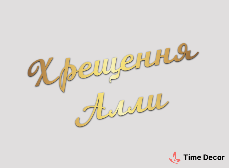 Пластиковий напис "Хрещення Алли" – дзеркальний або матовий пластик, можливе виготовлення з клейкою зворотною поверхнею для легкого монтажу.