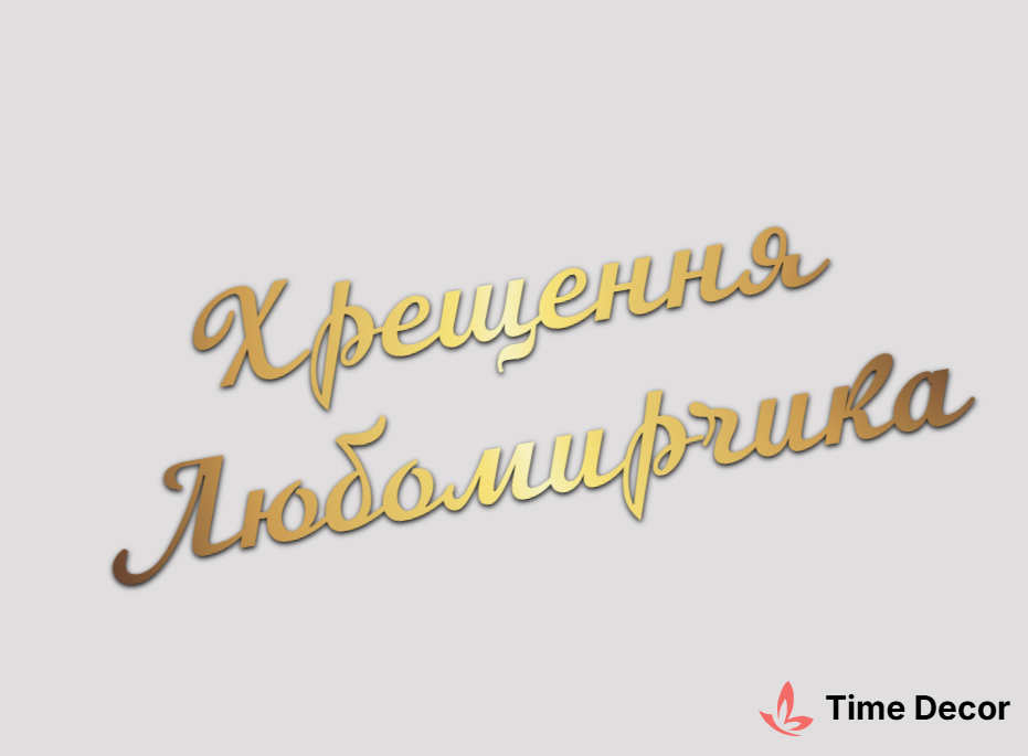Пластиковий напис "Хрещення Любомирчика" – дзеркальний або матовий пластик, можливе виготовлення з клейкою зворотною поверхнею для легкого монтажу.