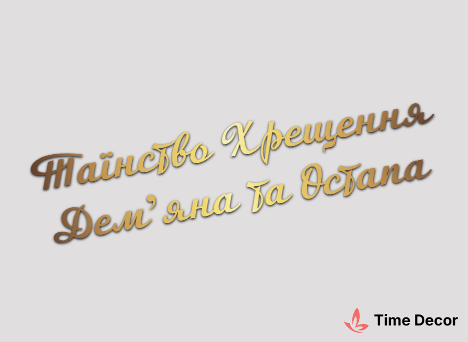 Пластиковий напис "Таїнство Хрещення Демʼяна та Остапа" – дзеркальний або матовий пластик, можливе виготовлення з клейкою зворотною поверхнею для легкого монтажу.