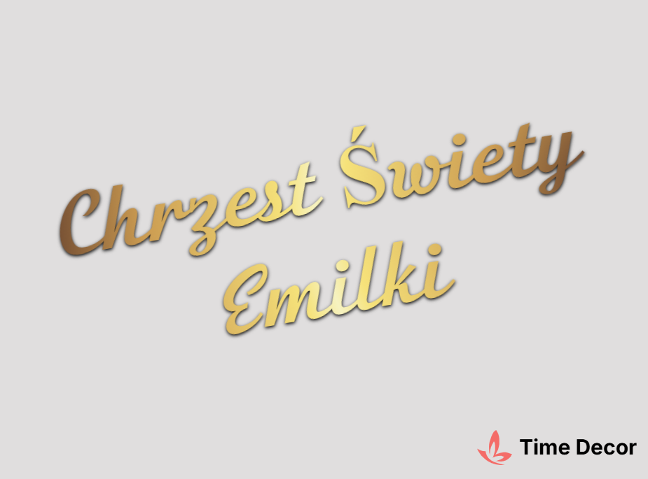 Пластиковий напис "Chrzest Świety Emilki" – дзеркальний або матовий пластик, можливе виготовлення з клейкою зворотною поверхнею для легкого монтажу.