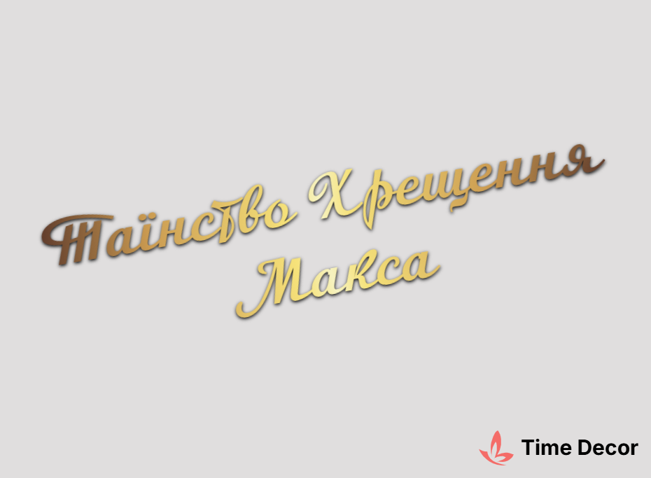 Пластиковий напис "Таїнство Хрещення Макса" – дзеркальний або матовий пластик, можливе виготовлення з клейкою зворотною поверхнею для легкого монтажу.