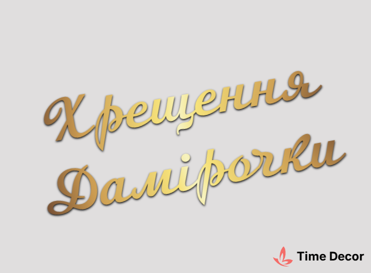 Пластиковий напис "Хрещення Дамірочки" – дзеркальний або матовий пластик, можливе виготовлення з клейкою зворотною поверхнею для легкого монтажу.